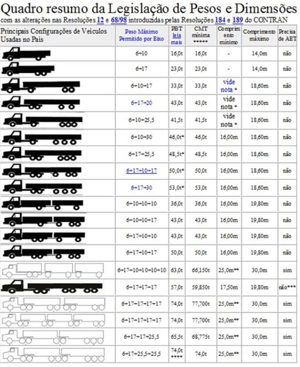 Segue a seguir imagens com tabelas mostrando o Peso Bruto Total (PBT) e/ou Peso Bruto Total Combinado. Para quem não sabe o que significa o termo, pense que o PBT é o peso do veículo vazio, sem carga, também chamado de tara, somado ao peso da carga.