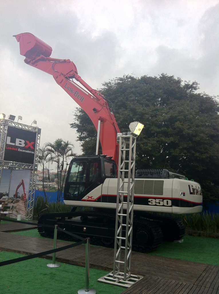 A Link-Belt trouxe a 350 da série X2 com peso operacional de 35.9 toneladas, e capacidade da caçamba de 2,24m³.